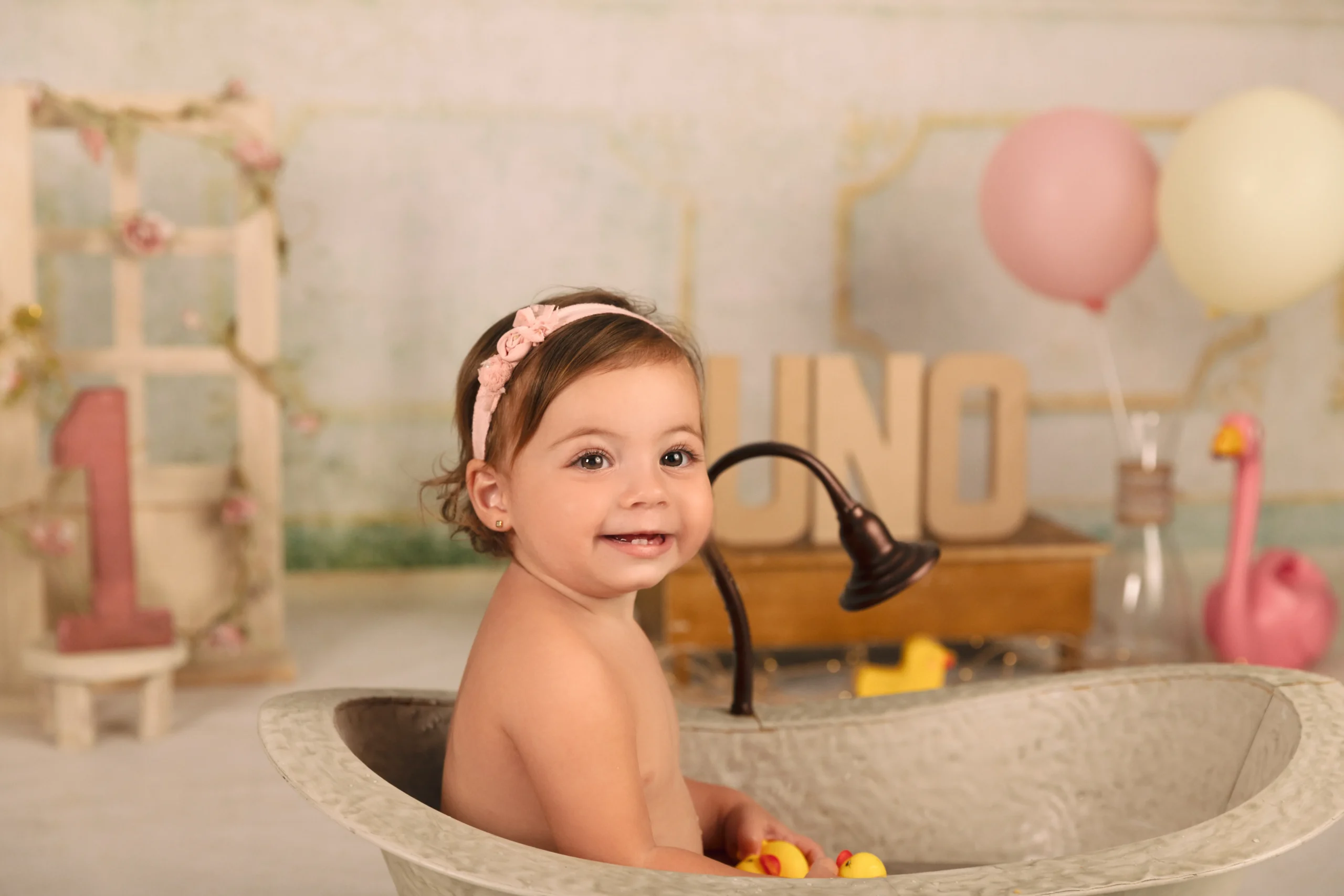Y para acabar, ¡un baño! Después de tanto dulce y tanta diversión, terminamos la sesión con un bañito en agua templada. A todos les encanta y nos regala imágenes frescas, naturales y llenas de alegría.